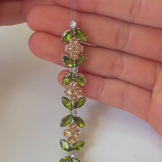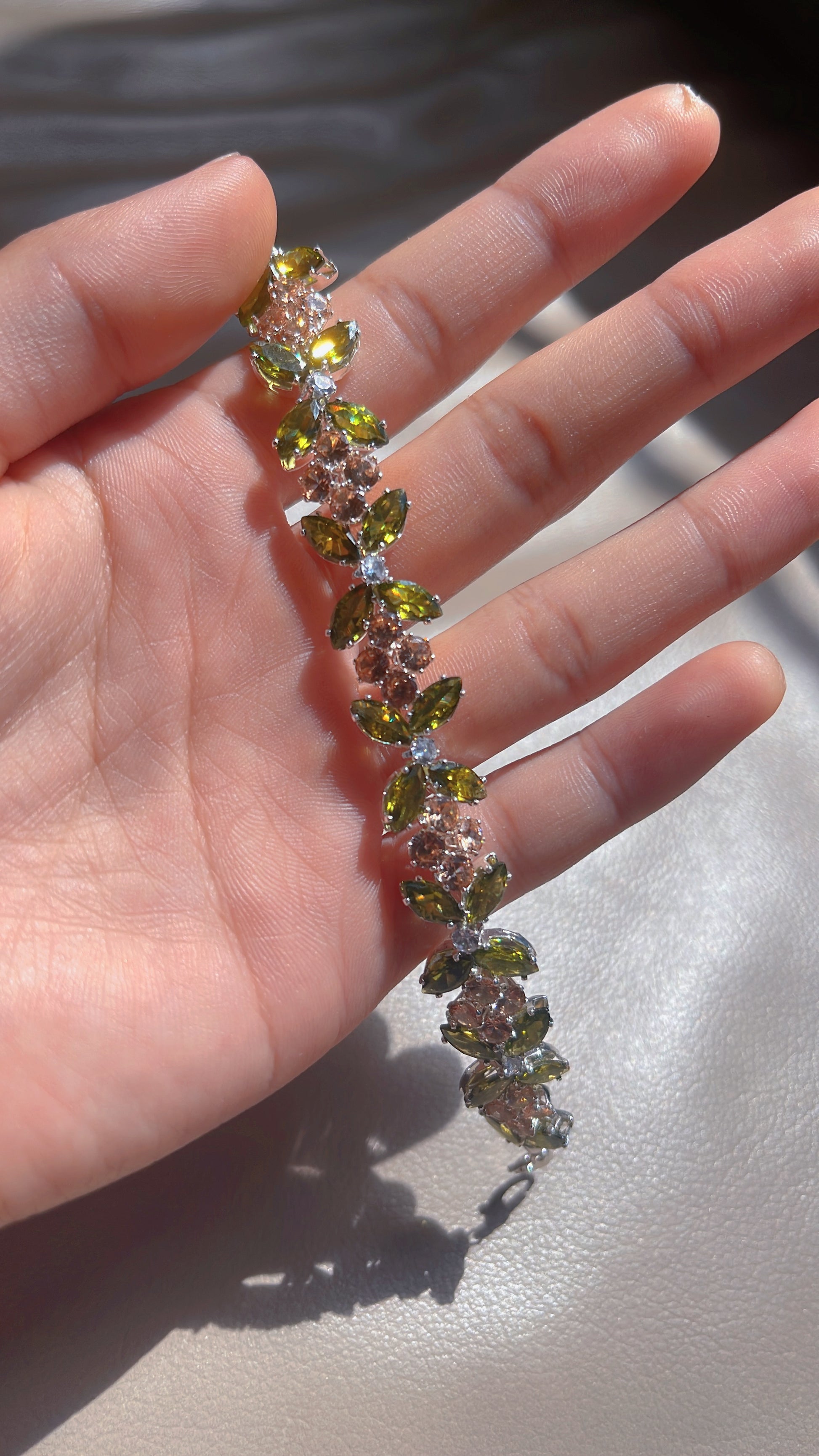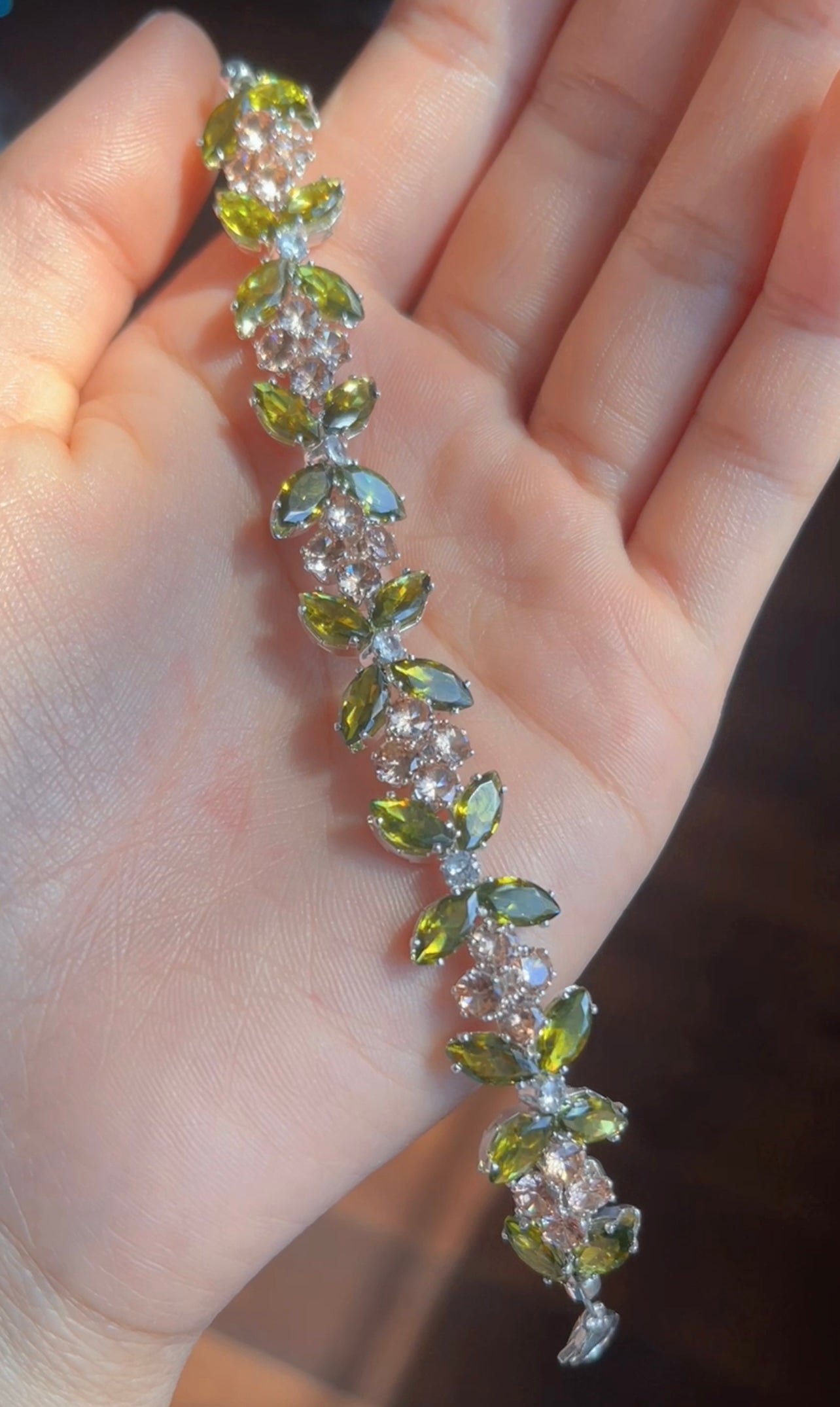 This handmade bracelet features sparkling crystal flowers and vivid green leaf-shaped crystals, creating a fresh and elegant design.
